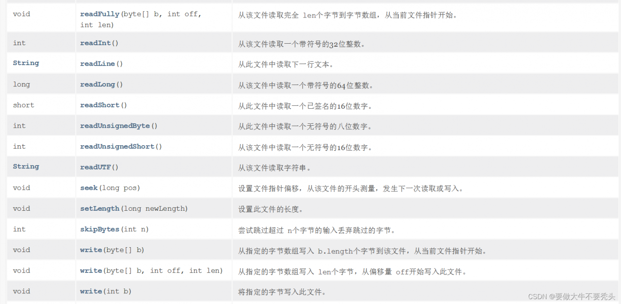 需要指定读取偏移量,seek(long pos)方法跳过偏移量,从指定位置后边开始读数据2.适用于文件末尾追加写入/指定位置写入数据