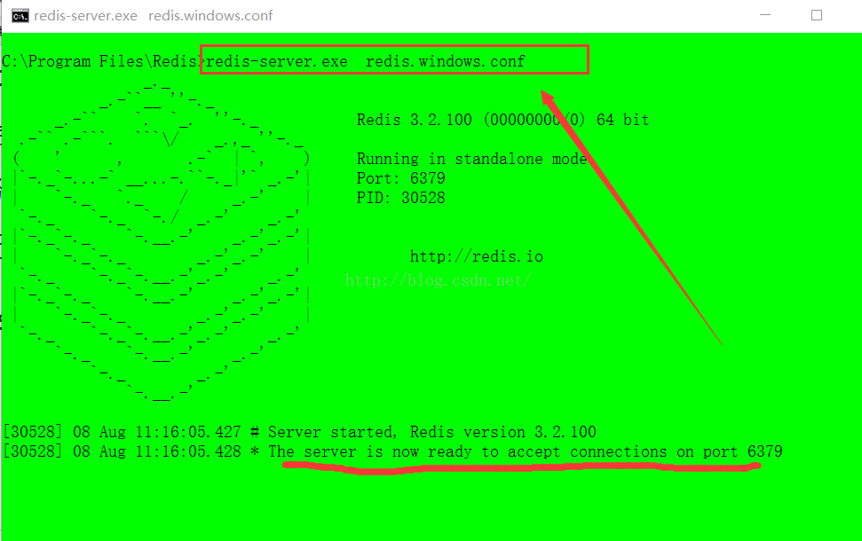 使用命令【redis-server.exe redis.windows.conf】,启动redis 服务。