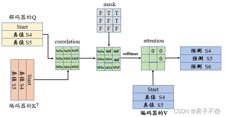 在图1.1中,s1与s2代表两个待翻译的句子,p则代表padding的信息,mask矩阵中的F (False)代表不需要mask,T (True)代表需要进行mask(即对padding信息进行掩盖)。通过mask矩阵将correlation矩阵对应位置的相关性值重置为负无穷,这样在通过softmax计算注意力矩阵时,相应位置的注意力权重则会变为0,进而通过attention对V进行信息聚合时舍去了p的信息。