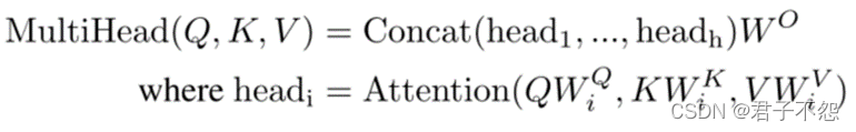 为了实现信息在不同特征空间的映射以提取更加丰富的表征,Transformer采用了多头注意力机制,公式如图4.2所示。