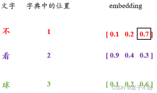 如图3.2,假设一句话有三个字,每个字根据其在字典中的位置映射为3维向量。那么,图中被框起来的0.7的位置,其pos=0(因为“不”字在这句话中的索引为0),i=2(因为0.7在“不”字的向量中的索引为2),以此类推可得到任意位置的位置编码。实现代码如下: