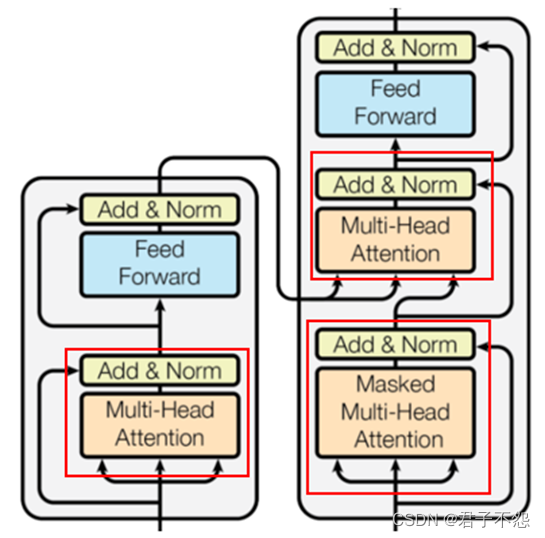 在Transformer中,用到Multi-Head Attention的部分共有三处,其区别仅在于他们的输入以及掩码矩阵不同,而网络结构是完全相同的。
