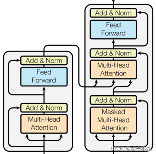 有了上述模块,我们即可按照图6所示的Transformer结构搭建一个编码器&解码器层(注:本文未将“Input Embedding”与“Positional Encoding”视为编解码器的一部分)。