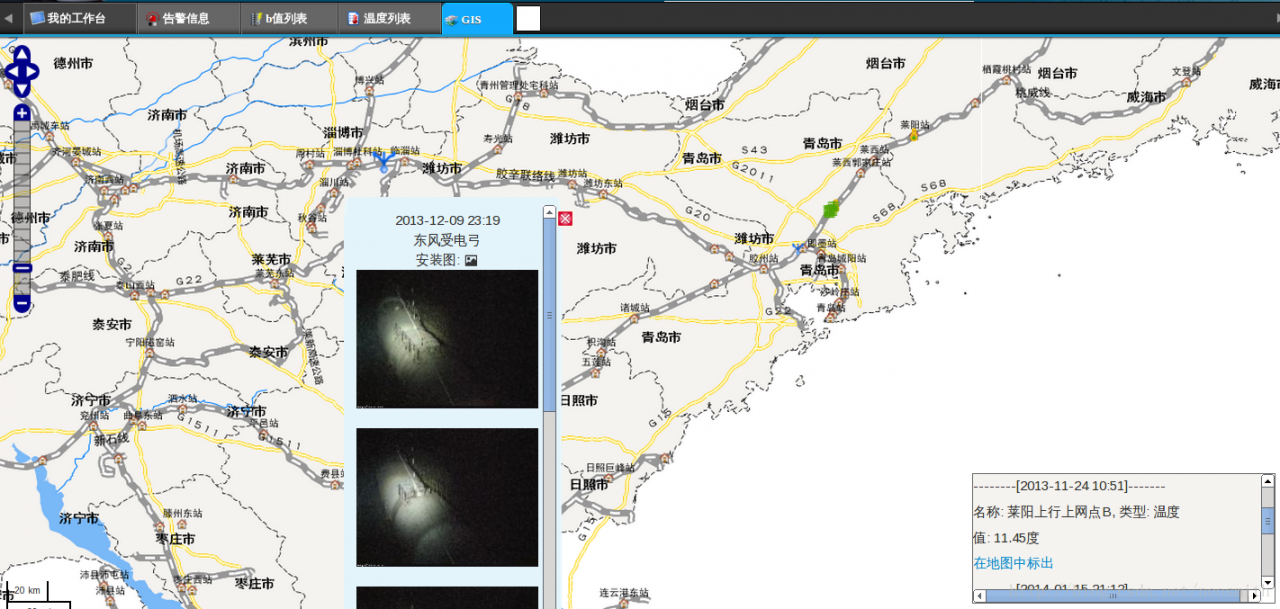 该系统是济南铁路局的一个试验项目,由硬件和软件两部分组成。硬件方面由另一家公司负责在200多个铁路监测点上安装传感设备,以监测温度, B值等铁路部门所感兴趣的数据。每隔几十分钟,监测数据就会自动上传到 POSTGRES数据库。我们软件的任务是,将数据库中的数据以表格、图表、地图等形式展示出来。其中,我负责GIS地图(地理信息系统)的开发,包括地图的绘制(ArcGis, UDig)、地图发布(GeoServer)、地图展示(OpenLayers, JavaScript)和部分数据库查询操作(JPA)。该项目使用 Seam-2.3框架,以JBoss-7.1为web应用服务器。