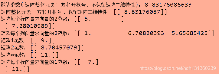 print "默认参数(矩阵整体元素平方和开根号,不保留矩阵二维特性):",np.linalg.norm(x)
