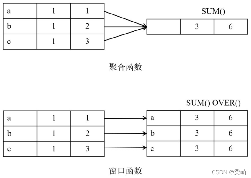 窗口函数(Window Function)可以像聚合函数一样对一组数据进行分析并返回结果,二者的不同之处在于,窗口函数不是将一组数据汇总成单个结果,而是为每一行数据都返回一个结果。聚合函数和窗口函数的区别如下图所示。