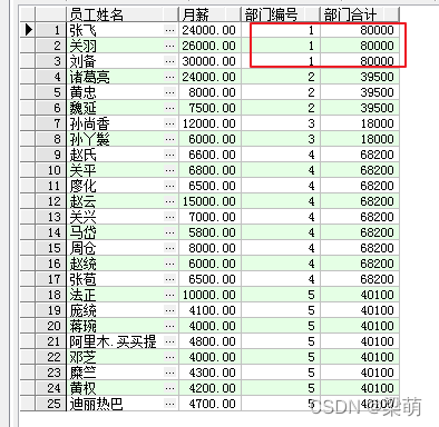 查询结果中的前3行数据属于同一个部门,因此它们对应的部门合计字段都等于80000(30000+26000+24000)。其他部门的员工采用同样的方式进行统计。