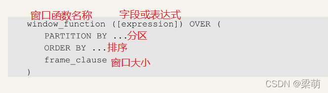其中window_function是窗口函数的名称,expression是可选的分析对象(字段名或者表达式),OVER子句包含分区(PARTITION BY)、排序(ORDER BY)以及窗口大小(frame_clause)3个选项。