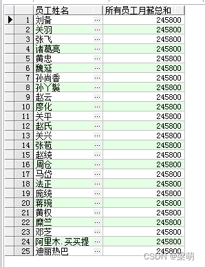 以上查询结果返回了所有的员工姓名,并且通过聚合函数SUM()为每个员工都返回了相同的汇总结果。