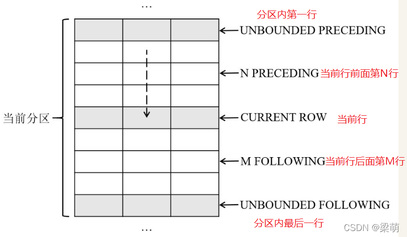 ●N PRECEDING——表示窗口从当前行之前的第N行开始。