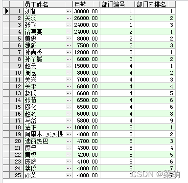 查询结果中的前3行数据属于同一个部门:“刘备”的月薪最高,在部门内排名第1;“关羽”排名第2;“张飞”排名第3。其他部门的员工采用同样的方式进行排名。