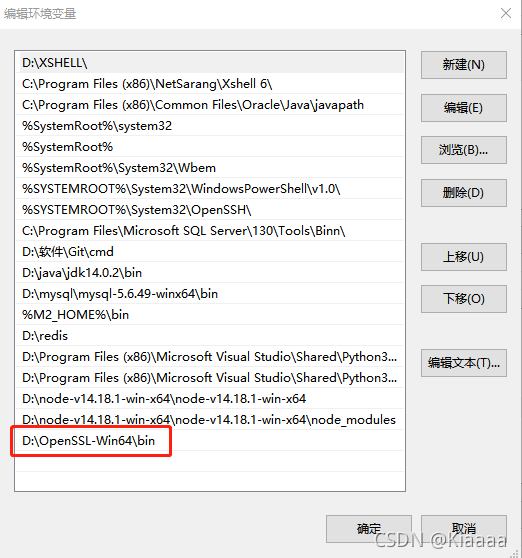 下载完成之后,将openssl安装路径bin的路径(例如D:\OpenSSL-Win64\bin)配置到操作环境系统变量path中: