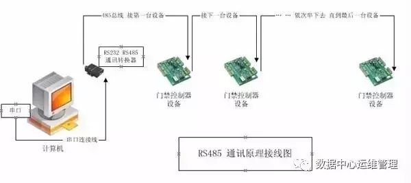 计算机通过 RS232 RS485转换器,依次连接 多台 485设备(门禁控制器),采用轮询的方式,对总线上的设备轮流进行通讯。