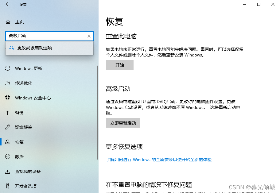 - 第一步:桌面上右键选择显示设置,搜索高级启动,点击高级启动下的“立即重新启动”。