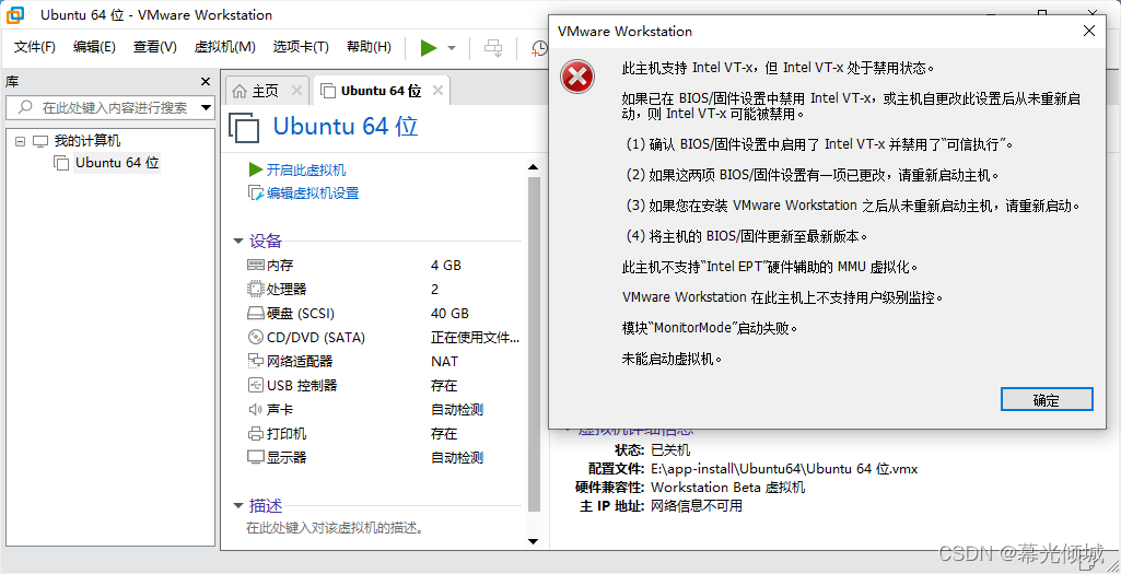 - 在VMware Workstation中,配置完Linux虚拟机后,运行该虚拟机的时候,报了这个错误,如下图。