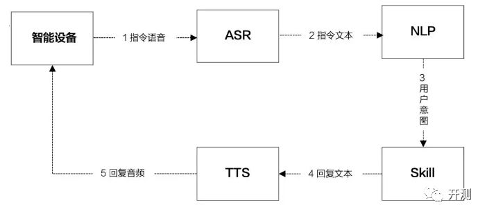 如下图所示,一次完整的语音交互,包含:唤醒→ASR→NLP→TTS→Skill的流程。