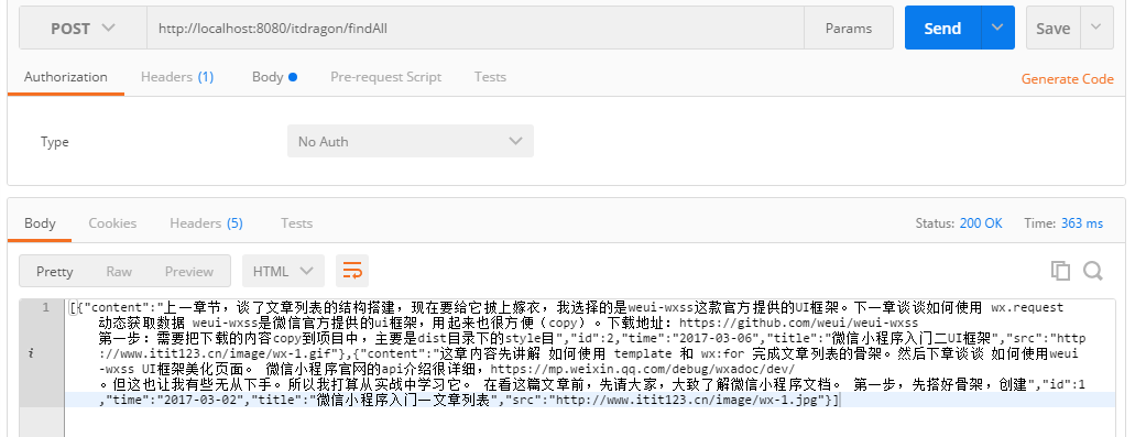 代码大致逻辑是一次最多查10条数据,并以id降序排序输出结果。代码并没有把整个对象放在一个集合中,而是把需要的内容(id,文章标题,预读内容,主图,创建时间)放在一个map,在放到集合转成json格式返回数据。(注:该代码只针对于现在的需求(查询数据),后续做下拉刷新,上拉加载,搜索排序时,可能会修改代码 。分页查询:微信小程序入门五上滑加载下拉刷新)。