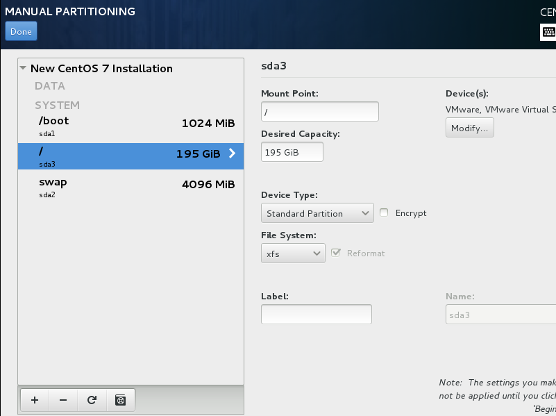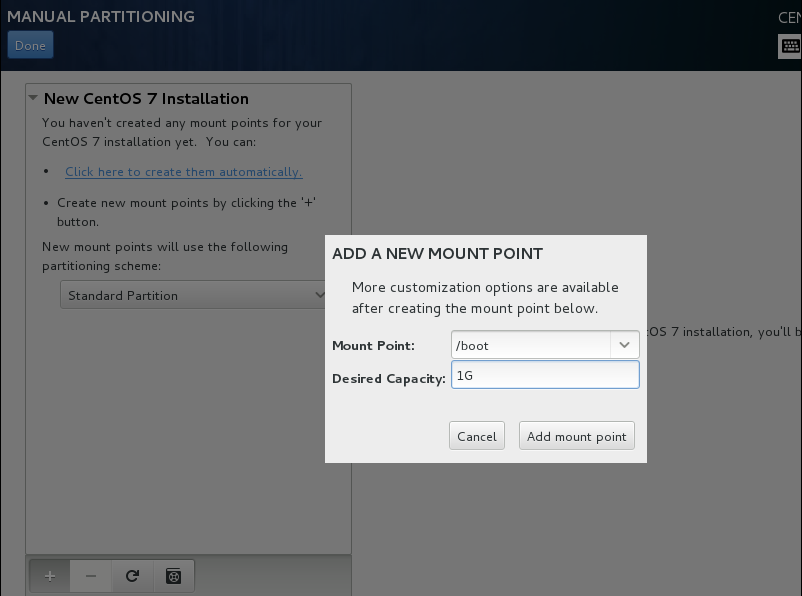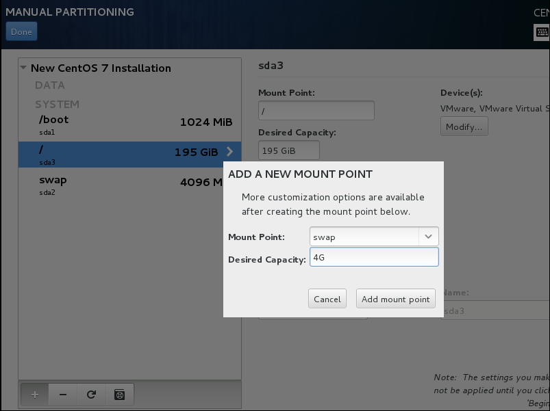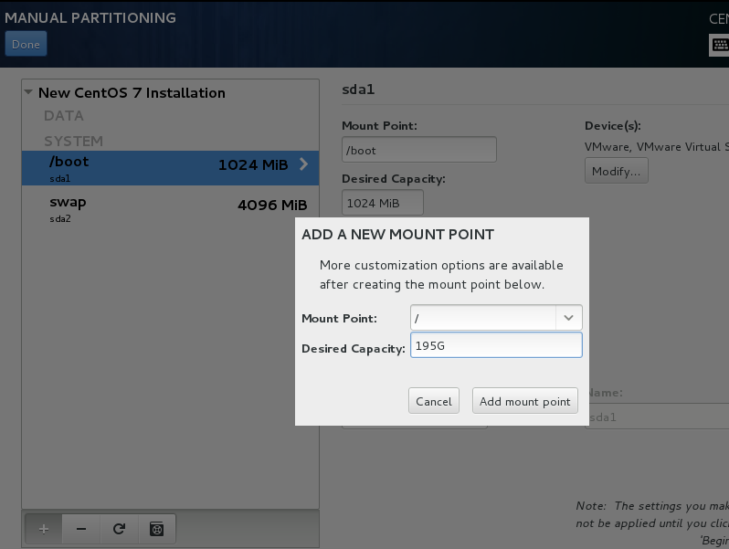 creat--Standard Partition--creat--mount point(挂载点)和File System Type(系统文件类型)