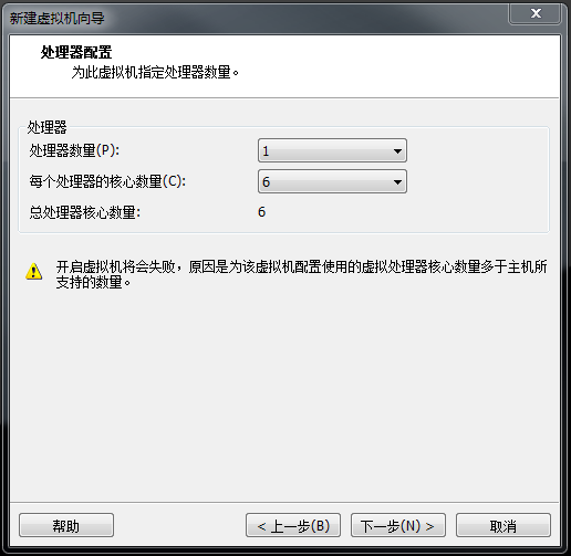 虚拟机总核心数不能超过主机核心数。若超出则会警告提醒。