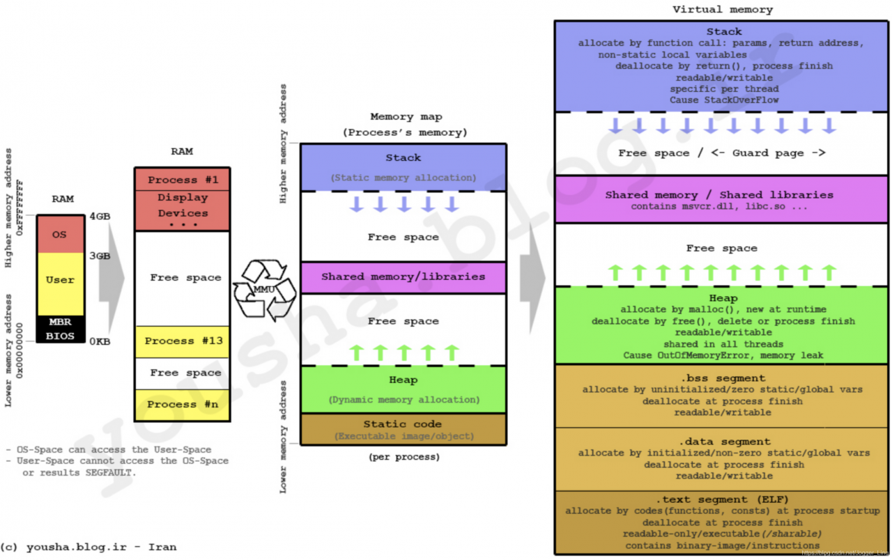 - 隔离适应(Segregated-Fit)— 将内存分割成多个链表,每个链表中的内存块大小相同,申请内存时先找到满足条件的链表,再从链表中选择合适的内存块;