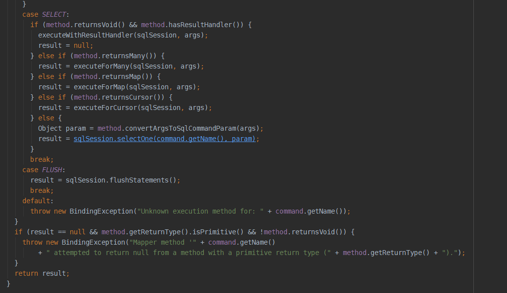 查询操作通过判断返回的类型,执行对应的方法,前面几种是比较经典的返回类型,如果都不满足,就会执行else内的方法,本次的selectNameById方法执行的就是else中的内容: