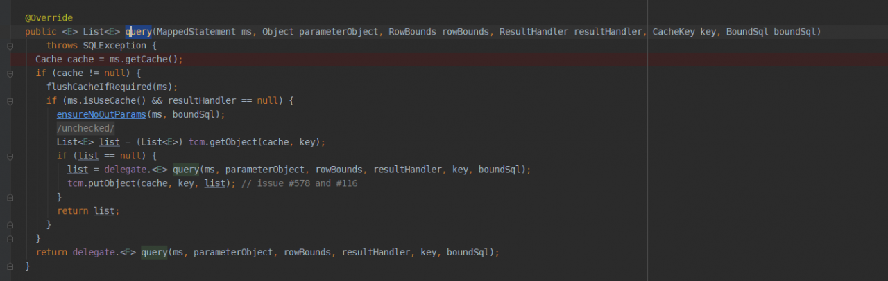 9、org.apache.ibatis.executor.CachingExecutor#query(org.apache.ibatis.mapping.MappedStatement, java.lang.Object, org.apache.ibatis.session.RowBounds, org.apache.ibatis.session.ResultHandler, org.apache.ibatis.cache.CacheKey, org.apache.ibatis.mapping.BoundSql)