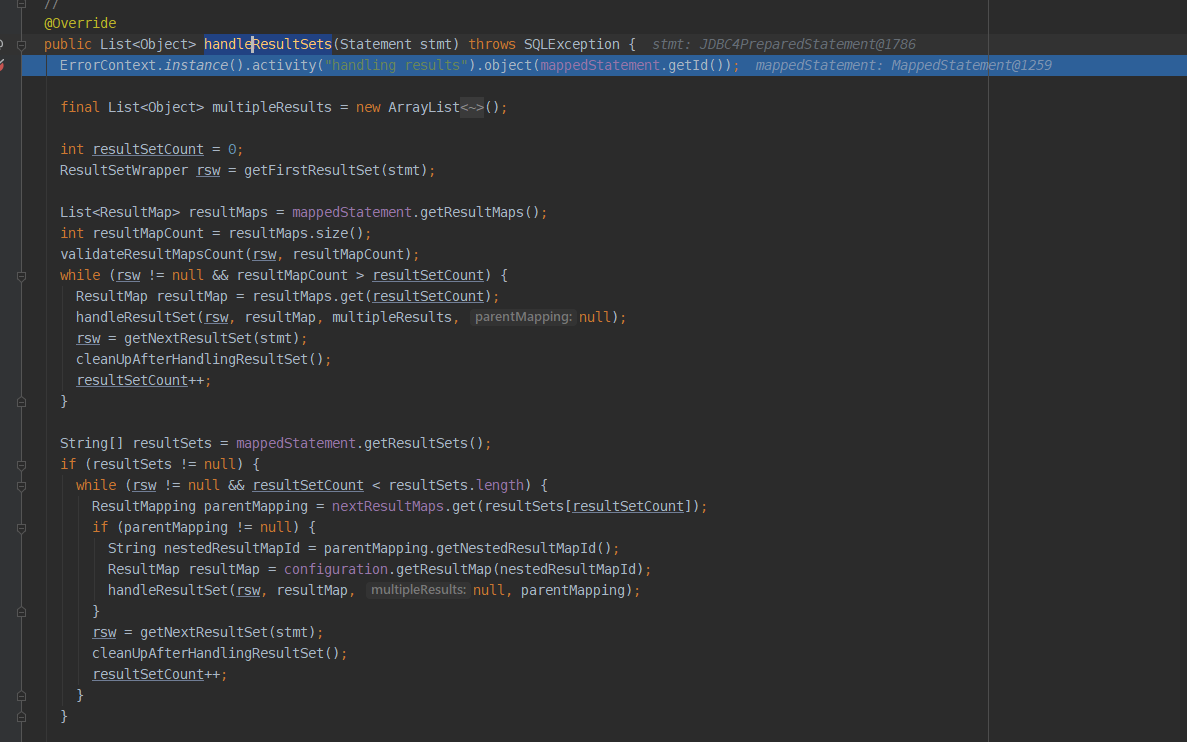 第一行是jdk中jdbc的类,执行获取预编译操作,然后执行了ps.execute();,这个就是我们的jdbc方法!终于到这里了!resultSetHandler是mybatis的对象,包装jdbc的结果,我们继续看:
