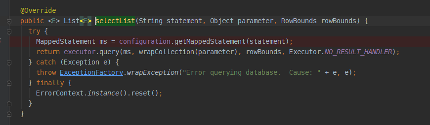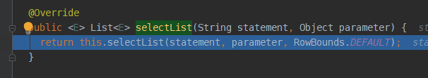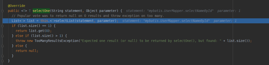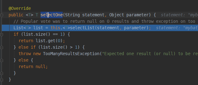 就是直接调用sqlSession中的方法,上面图片例子中的两个参数就是我们前面的过程在组合的参数,也就是说获取mapper对象执行方法最终的过程也是执行sqlSession中的内容,和上面这种方法殊途同归。我们继续来看selectOne中的内容,selectOne最终的执行过程也是执行selectList查询一个列表,然后获取列表中的第一个元素,继续看selectList方法: