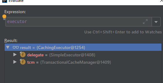 上面这个过程就是一级缓存的内容,如果缓存里不为空,就从缓存中查询,如果缓存为空,就查询数据库,这里启动程序只进行一次查询,所以会走查询数据库的分支,最后一行的delegate对象,也是一个Executor对象,这里走不使用缓存的分支,执行操作使用的BaseExecutor对象: