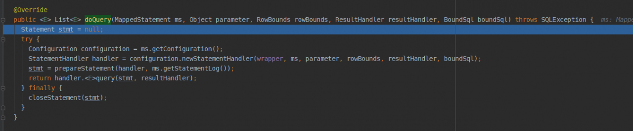 这条代码分支,从名字可以看出从数据库查询,参数中传了很多,除了编译好的SQL,还有分页,结果的handler,等等,这些是mybatis封装jdbc后以自己的特色去执行SQL的方式,这种麻烦的方法简化了我们使用mybatis的方式,下面继续看: