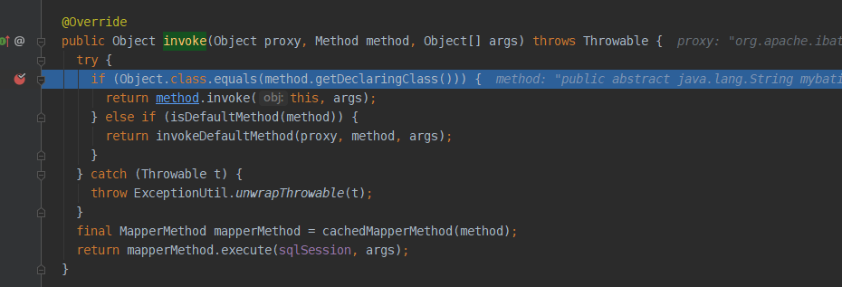 其中第一个if判断 if (Object.class.equals(method.getDeclaringClass())) ,这个MapperProxy就是一个InvocationHandler(他的作用是jdk创建动态代理时用的,没印象的可以复习一下),也就是我们会根据当前的接口创建一个这个接口的动态代理对象,使用动态代理对象再利用反射调用实际对象的目标方法。