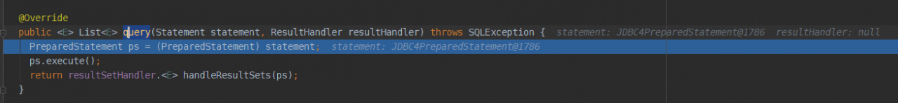 这里进入了SimpleExecutor类中,第一行的Statement stmt =null;代码有点眼熟,就是我们jdbc中的Statement 对象,说明我们马上要接近真相了!继续,前面三个是对SQL语句进行预编译,然后执行query方法,通过debug,知道下一步执行这个方法: