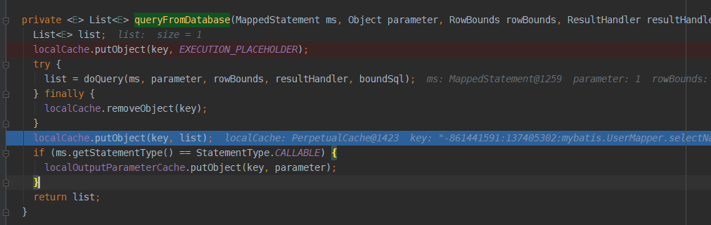 这里把最终的查询结果放到了一级缓存中,然后继续往回执行: