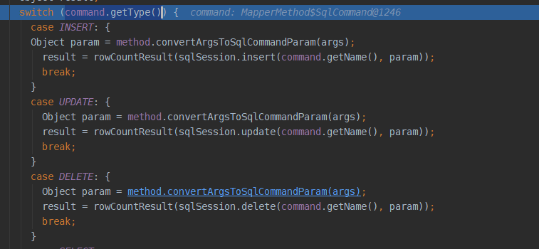 进入这个方法可以看到,内容很丰富,开始是一个判断语句块,判断当前的操作是什么类型,我们通过idea来看一下正在执行的是什么类型: