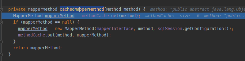 这是个典型的从缓存中获取方法对象的代码,如果缓存中没有,就新建并加入缓存,最后返回这个方法,methodCache对象是一个map,存储了创建过的方法对象,创建的方式是根据接口,方法和配置对象进行创建。到这里我们就获取了我们实际要执行的方法的对象了。
