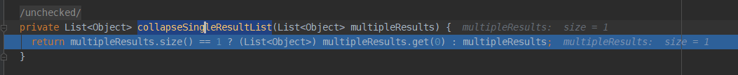 这里面包含的记过的很多熟悉,类型,名称,对象的类型,等等。我们继续来看handleResultSets方法,组合好多个返回结果的list后,我们看最后一行代码,执行collapseSingleResultList方法: