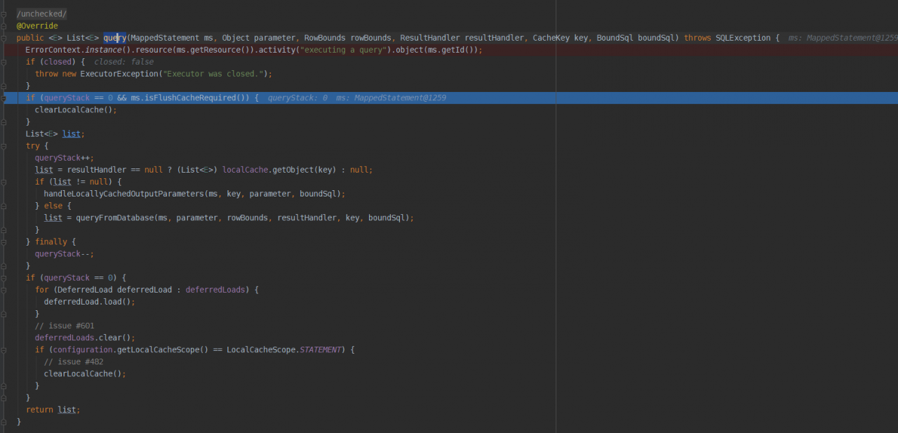 10、org.apache.ibatis.executor.BaseExecutor#query(org.apache.ibatis.mapping.MappedStatement, java.lang.Object, org.apache.ibatis.session.RowBounds, org.apache.ibatis.session.ResultHandler, org.apache.ibatis.cache.CacheKey, org.apache.ibatis.mapping.BoundSql)