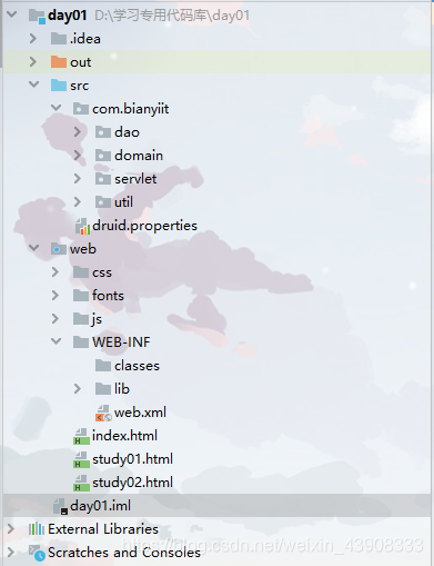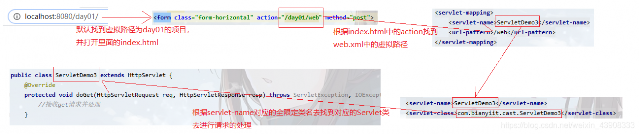 http://localhost:8080/day01/web,根据虚拟路径/day01去定位到具体的项目,再根据具体要请求的资源/web,去web.xml里面找