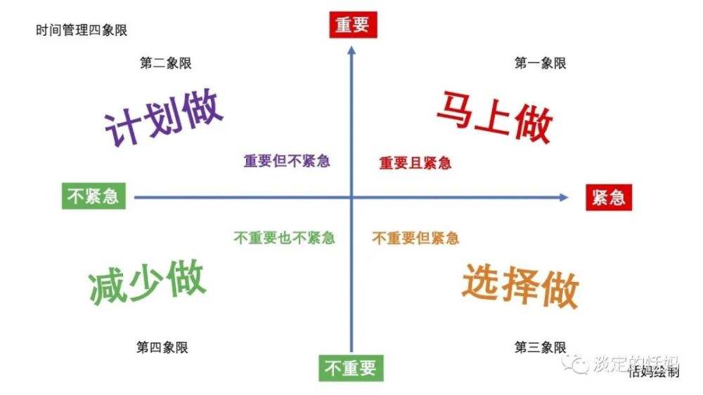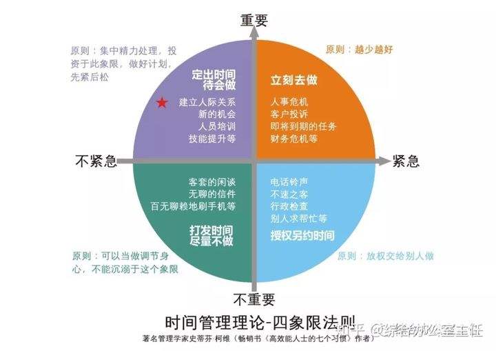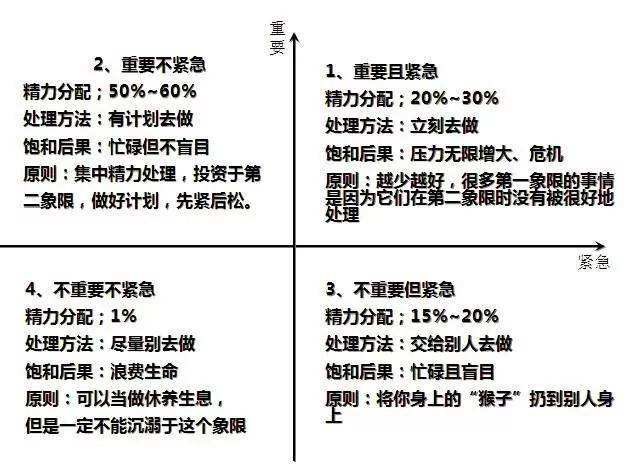 时间“四象限”法是美国的管理学家科维提出的一个时间管理的理论,把工作按照重要和紧急两个不同的程度进行了划分,基本上可以分为四个“象限“。