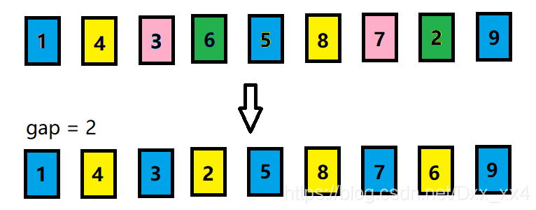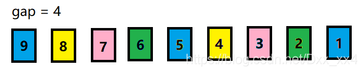 以下面这个逆序的序列为例,在这个序列中,size = 9,因此第一次分组时 gap = 4,即每组的间隔为4,在图中表示为颜色相同的为一组: