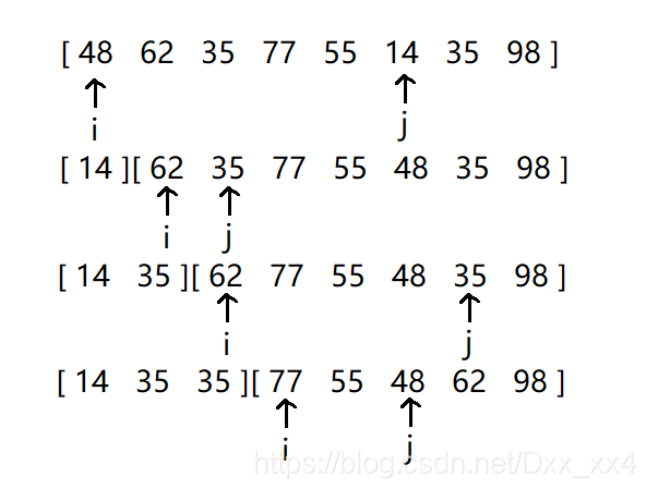 快慢指针法和上述两个方法略有不同,但快慢指针法的应用范围更广,在链表中也能很好的使用,使我们必须掌握的排序方法。