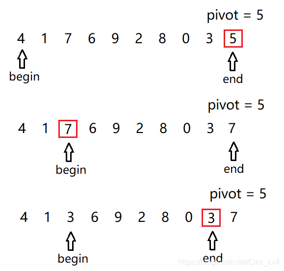 首先我们选择序列中的最后一个元素作为基准元素,并用变量pivot保存它的值,定义一个begin指针指向序列开头,一个end指针指向序列末尾,此时end指针指向的位置就可以看作是一个“坑”。我们让begin指针从序列开头开始遍历,遇到第一个大于基准元素的元素时停止遍历,即begin在 7 处停止遍历,并将 7 放入end所指向的“坑”中,此时begin所指向的位置就变成了“坑”。再让end开始遍历,当end遇到第一个小于或等于基准元素的元素时停止遍历,即当end指向 3 时停止遍历,再将 3 放入begin指向的“坑”中,此时,end所指向的位置就又变成了“坑”,后面以此类推。