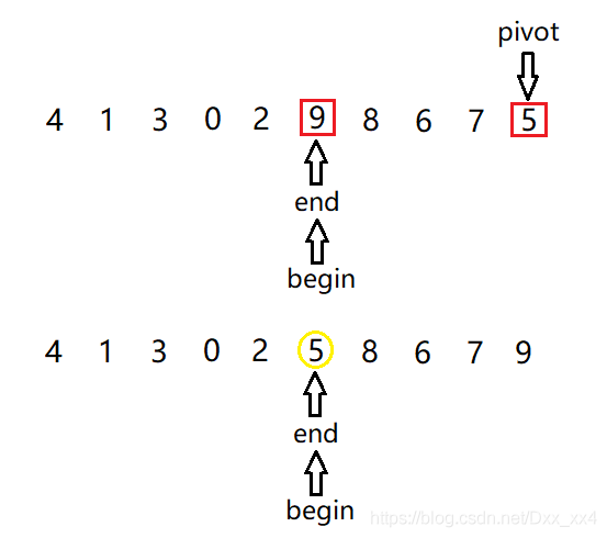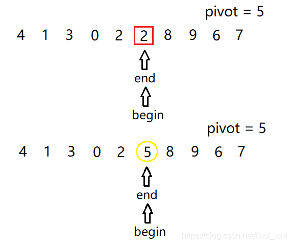 当begin指针与end指针相遇时,如下图所示,此时begin指针和end指针共同指向的是序列中第一个大于基准元素的元素,那么我们只需要交换begin指针与pivot指针所指向的元素,就可以完成让基准元素左边的元素全部小于或等于基准元素,基准元素右边的元素全部大于基准元素。