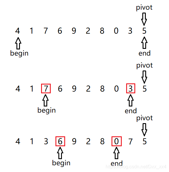 首先我们用pivot指针标记最后一个元素作为基准元素,再定义一个begin指针指向序列的开头,一个end指针指向序列的末尾,让begin指针从序列开头开始遍历,当begin指向的元素小于或等于基准元素时,begin向后走,当begin遇到第一个大于基准元素的元素时,begin停止遍历,end从序列末尾开始遍历,当end指向的元素大于基准元素时,end向前走,当end遇到第一个小于基准值的元素时,end停止遍历,此时交换begin指向的元素和end指向的元素,继续遍历,直到begin和end相遇,交换begin指向的元素与pivot指向的元素,第一趟排序完成。