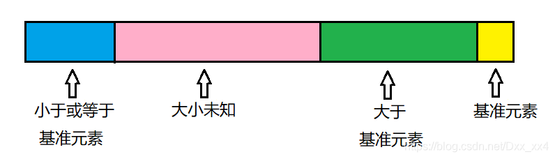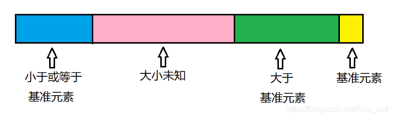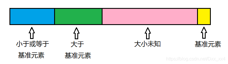 2)将待排序的元素进行分区,比基准元素大的元素放在它的右边,比其小的放在它的左边;