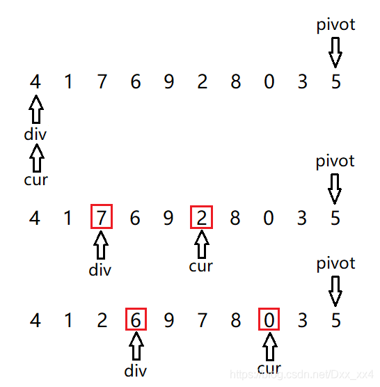 首先我们还是确定序列的最后一个元素为基准元素,用指针pivot标记,再定义一个div指针和一个cur指针同时指向序列的开头。这里我们要清楚,虽然div和cur是同时从序列的开头出发,但div指针是指向序列中第一个大于基准元素的元素的,而cur指针是在序列中寻找小于或等于基准元素的元素,并与div指向的元素进行交换,使得小于基准元素的元素与大于基准元素的元素分开。一开始div指针和cur指针同时开始遍历,当遇到第一个大于基准元素的元素时div停止遍历,cur继续向后遍历,当cur指向的元素小于或等于基准元素时,交换div与cur所指向的元素,div向后走一个,继续指向序列中第一个大于基准元素的元素,cur继续向后遍历,当cur指针与pivot指针相遇时,将基准元素与div指向的元素交换,第一趟排序结束。