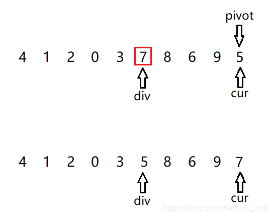 当cur指针与pivot指针相遇时,基准元素之前的序列中所有小于等于基准元素的元素全部都在大于基准元素我的元素前面,因为div指向的是第一个大于基准元素的元素,那么我们只需要交换div指向的元素与基准元素,就可以将基准元素放在比它大的元素和比它小的元素之间,第一趟排序完成。
