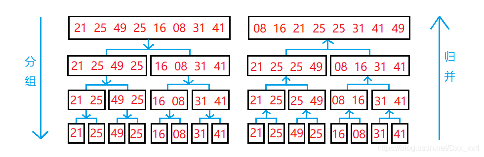 1、分组。停止条件:①分出的小区间已经有序(区间内只有一个元素)②分出的小区间内没有元素。