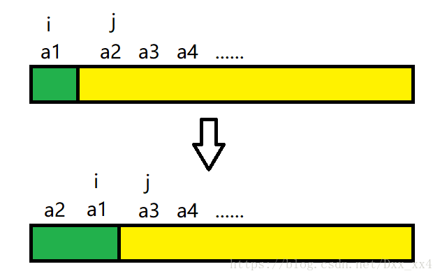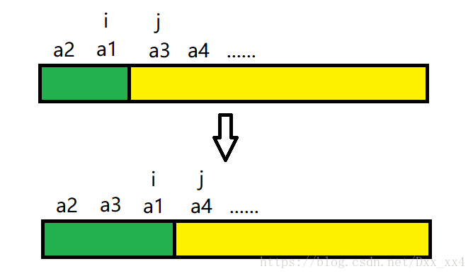 接下来我们来看第二个元素 a2,假设 a2 < a1,那么我们交换 a2 和 a1,并且让 i 指针左移一个,j 指针左移一个,此时 i 指针已超出数组范围,说明 a2 已到了正确的位置,此趟排序结束,得到一个新的有序序列,再将 i 指针指向有序序列的最后一个元素,将 j 指针指向无需数组的第一个元素,准备下一趟排序,如下图。