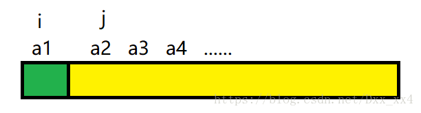 具体来说,首先,我们将一个无序数组分看做两个子序列,如下图。在第一个子序列中只有一个元素,因此可以将它看做有序,并且用一个指针 i 指向有序序列的最后一个,即 a1,再用一个指针 j 指向无序序列的第一个元素,即 a2,准备下次一排序。